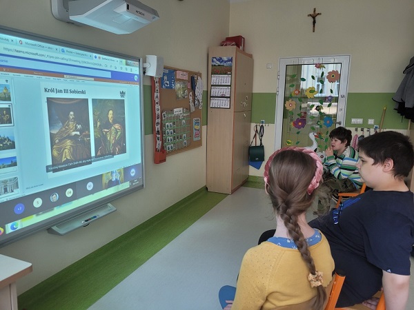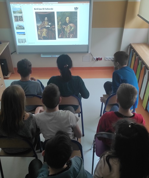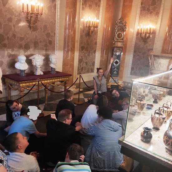 Rozglądając się z uwagą wielu uczniów dostrzegło znajome przedmioty i obrazy. Ich rozpoznanie było możliwe, ponieważ do tej lekcji przygotowaliśmy się podczas zajęć online, które w piątek, 6 maja dla uczniów klas III – VIII poprowadziły Panie edukatorki z Pałacu.