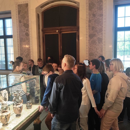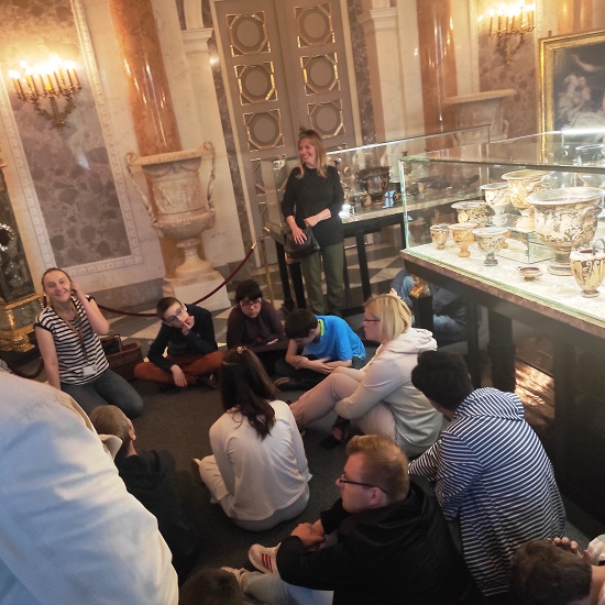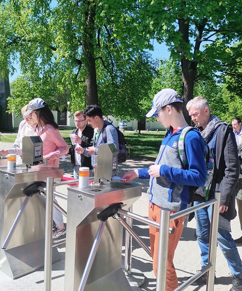 Uczniowie ze spokojem oczekiwali na tramwaj i na autobus oraz na potwierdzenie naszej obecności w kasie biletowej Pałacu. Zgodnie z podpowiedzią Pani nadzorującej wejścia, poprawnie zeskanowali swoje bilety i pod kierunkiem Pani edukator Kasi weszli do historycznej rezydencji.