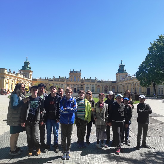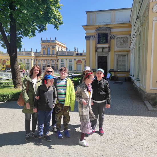 W słoneczny wtorek, 10 maja 2022 roku grupa uczniów wybrała się w daleką podróż. Po długich miesiącach, w których obowiązywały ograniczenia i nie można było wychodzić na zajęcia poza szkołę, wszyscy wyruszyli z radością na lekcję muzealną do Pałacu Króla Jana III w Wilanowie. I chociaż uczestnicy zgodnie przyznali, że owszem, Pałac w Wilanowie jest dość daleko od naszej szkoły, to jednak cóż znaczy dla podróżników odległość? Absolutnie nic, bo przecież można ją pokonać!