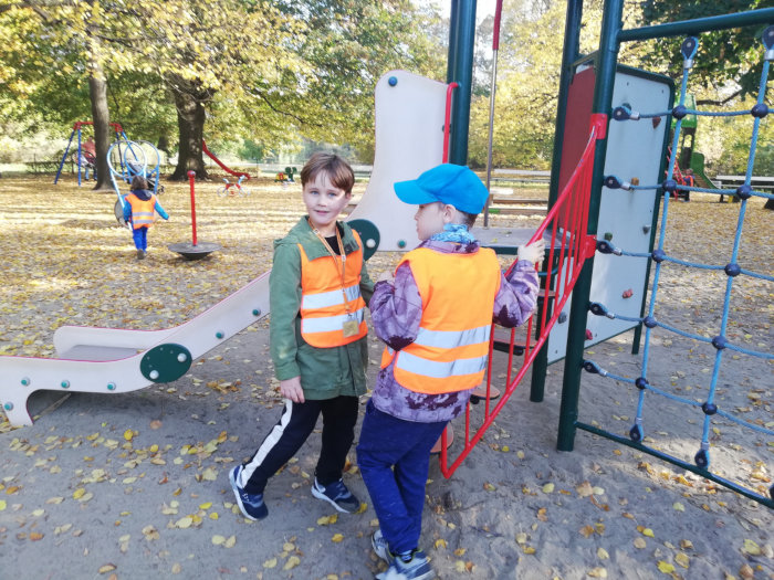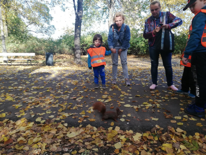 To że mamy piękną polską jesień to powiedzieć mało. W ciepłym słońcu spacer parkowymi ścieżkami obfitował w coraz to bardziej fantastyczne oznaki tej pory roku. Emocje i podziw na widok tańczących na wietrze liści zachwycił nas wszystkich w sposób trudny do opisania. Nie tylko zresztą barwna flora zwróciła na siebie naszą uwagę, ale i rude wiewiórki, które ciekawe naszej grupy podchodziły ostrożnie do nas. Była to więc wyjątkowa okazja jak w bezpiecznej odległości obserwować zwierzęta i całą przyrodę. Swoją przygodę zakończyliśmy harcami na pobliskim placu zabaw, który otoczony drzewami był tak inny niż ten, który znamy z naszego przedszkola. Z pewnością odwiedzimy Park Skaryszewski jeszcze nie jeden raz by przekonać się jak nadal zmienia się przyroda i żeby po prostu dobrze się bawić.