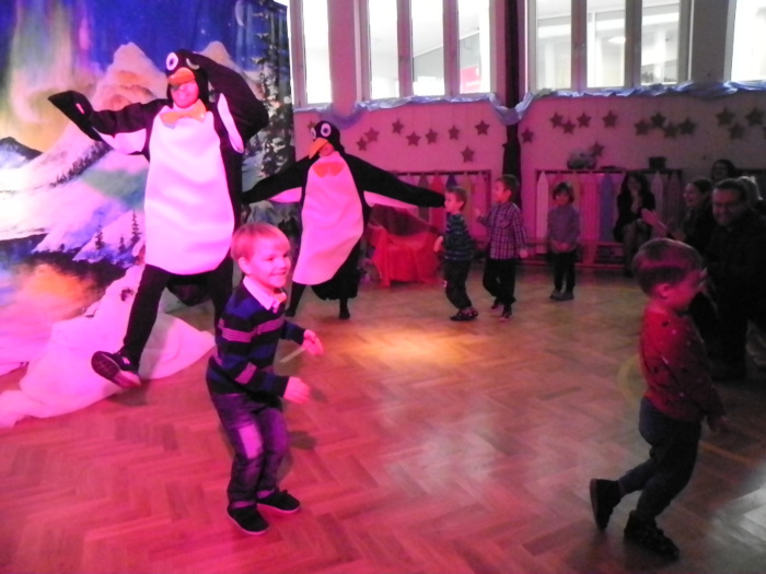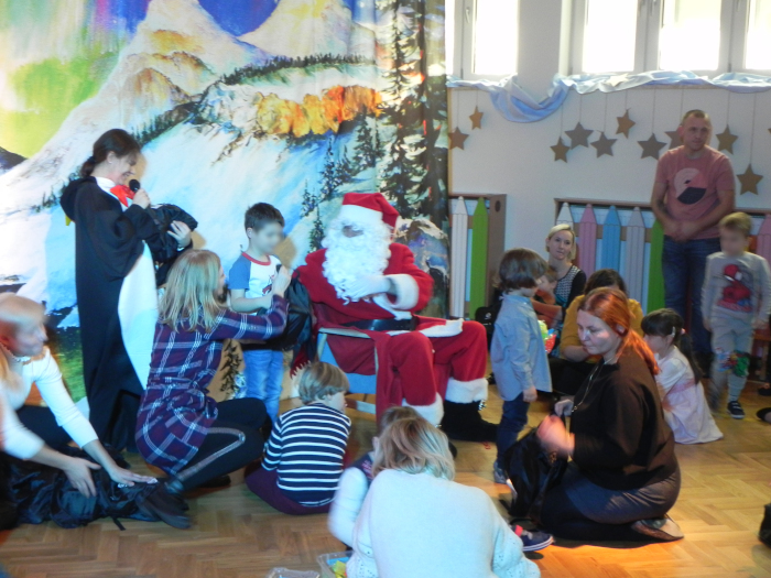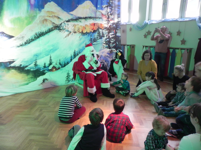 Ręcznie malowana scenografia przedstawienia, światła oraz muzyka przyczyniły się do tego, że poczuliśmy klimat świąt. Na początku Pani dyrektor Ewa Warszewska zaprosiła nas na spektakl zorganizowany przez Teatr Katarynka pt. "Polarna przygoda". Aktorzy podczas spektaklu zapraszali dzieci do wspólnego tańca, zadawali pytania i prosili o pomoc. W pewnym momencie kiedy z oddali słychać było dźwięk dzwonka to był znak, że Mikołaj przybył do przedszkola. Wszystkie dzieci zaśpiewały dla niego piosenkę pt. „Taki duży, taki mały” po czym zaczęło obdarowywanie prezentami. Później każdy chciał zrobić sobie pamiątkowe zdjęcie z Mikołajem.