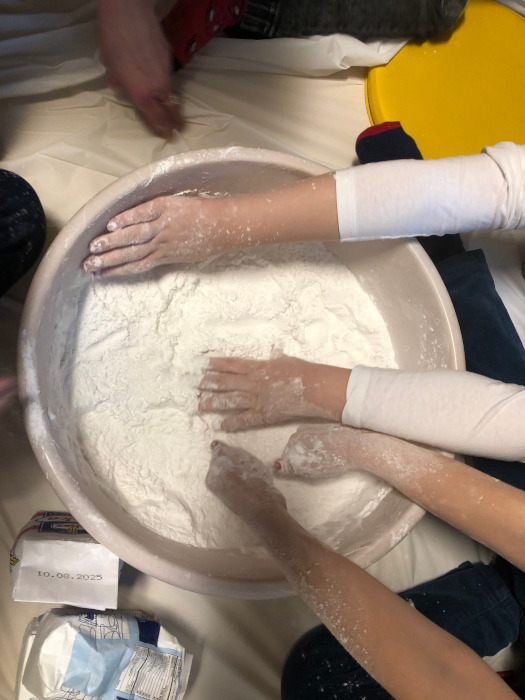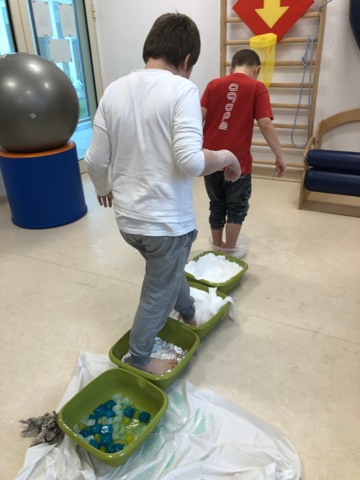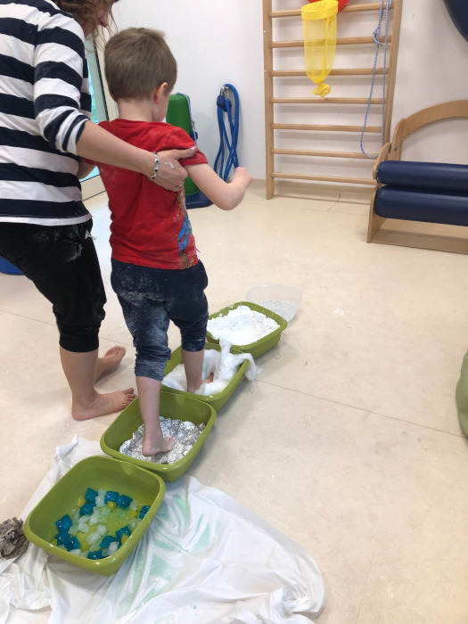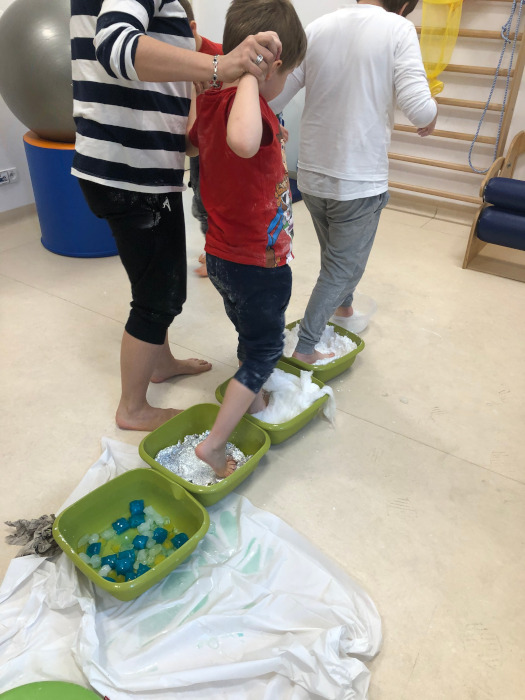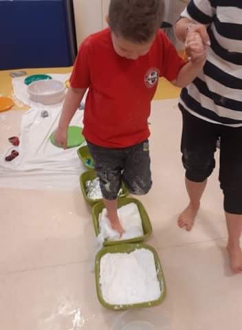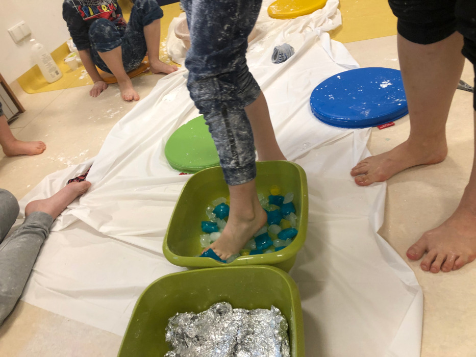 Dzieci z ochotą i skupieniem zagniatały masę z mąki ziemniaczanej i mydła w płynie, wytwarzając swój własny, „ciepły śnieg”. Zabawa była doskonałą okazją, nie tylko do brudzenia się, ale także do usprawniania rąk, doświadczania wrażeń dotykowych w obszarze dłoni, nóg, pozwalała na kreatywność i poczucie sprawczości. Największą atrakcją dla chłopców był jednak tor przeszkód złożony z kolorowych kostek lodu, waty, foli aluminiowej, „ciepłego śniegu” i wody. Dzieci początkowo z obawą i ostrożnością doświadczały nowych wrażeń sensorycznych. Po czym z ogromną radością i ekscytacją ustawiały się w kolejce do przejścia, prosząc o jeszcze. Zabawy nie było końca.