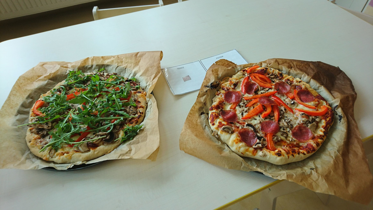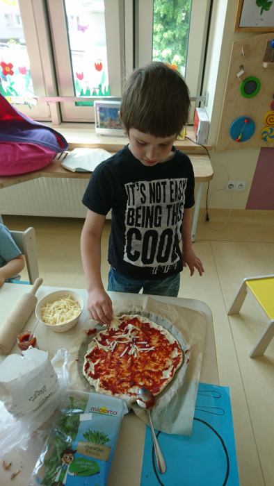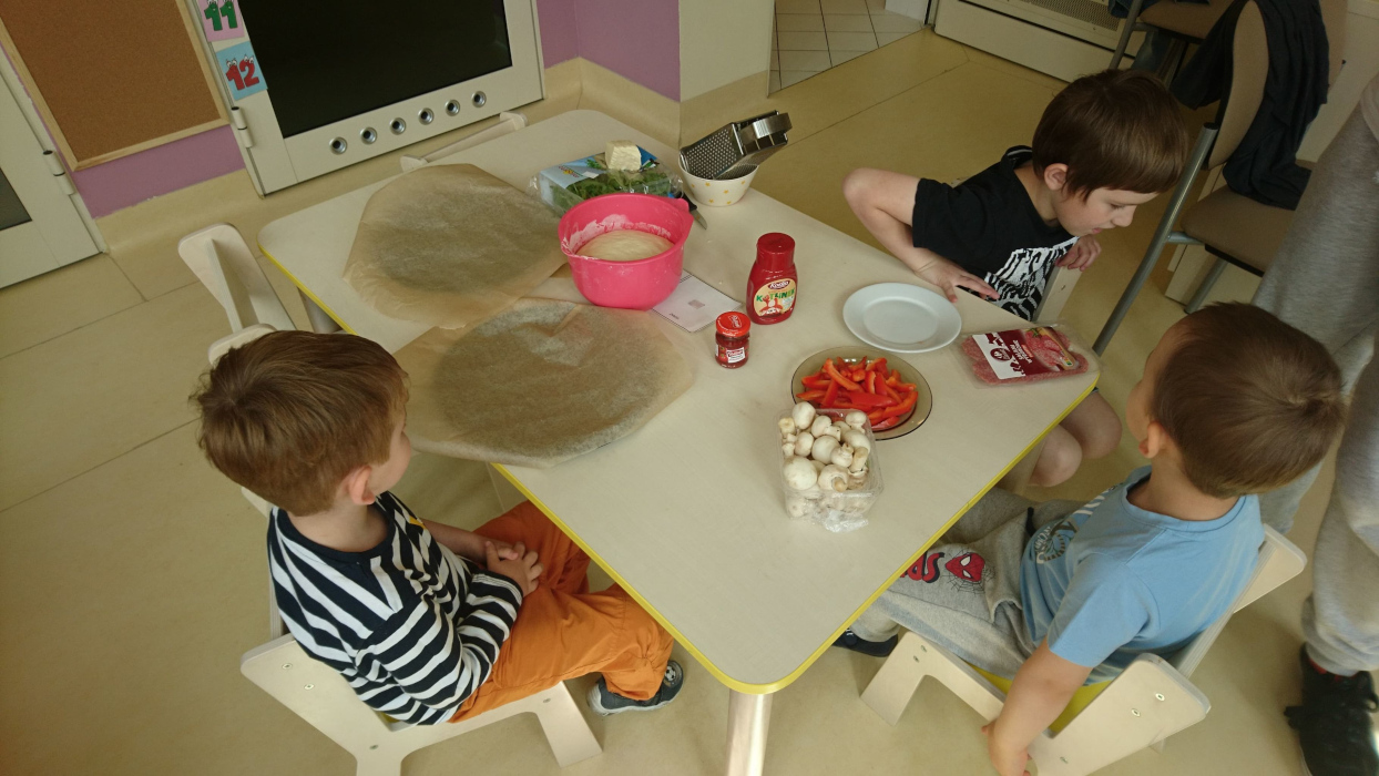 Pizza to wręcz niezastąpiona okazja do zapoznania dzieci z różnorodnością pokarmową. Kombinacje ciasta, warzyw, sera i sosu to przepis na najpopularniejszą królową włoskiej kuchni, której oprzeć się nie mogą również nasze przedszkolaki. Nie zabrakło również bezglutenowego ciasta lub przepysznych gofrów obsypanych kawałkami naturalnie słodkich owoców. Nasze zajęcia kulinarne to też ważne zasady higieny rąk przed przystąpieniem do pracy, jak i zadbanie o dokładne umycie składników tego wymagających. Gdy wszystko już jest gotowe, zaczyna się prawdziwa praca i zabawa. Ciasto trzeba rączkami i wałkiem rozciągnąć, z pomocą nauczycieli wszystko prawidłowo pokroić, rosmarować co potrzeba lub posypać czym trzeba dla wyjątkowego smaku. Wszystko też uważnie dzielimy i odmierzamy proporcje. Wachlarz smaków, zapachów i wrażeń dotykowych nie ma końca, co jest kapitalnym uzupełnieniem choćby integracji sensorycznej. Można też nazwać i wskazać składniki, aby rozwijać swoją wiedzę i komunikację.