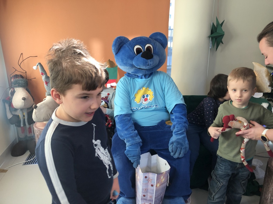Dzieci otrzymały upominki - maskotki Małpki wykonane ręcznie ze skarpetek. Wszystkim podobały się kolorowe, miłe w dotyku prezenty, które wręczał Miś dr Clown. Wolontariusze tej fundacji dzielą się uśmiechami i dobrą energią z dziećmi w różnych placówkach.