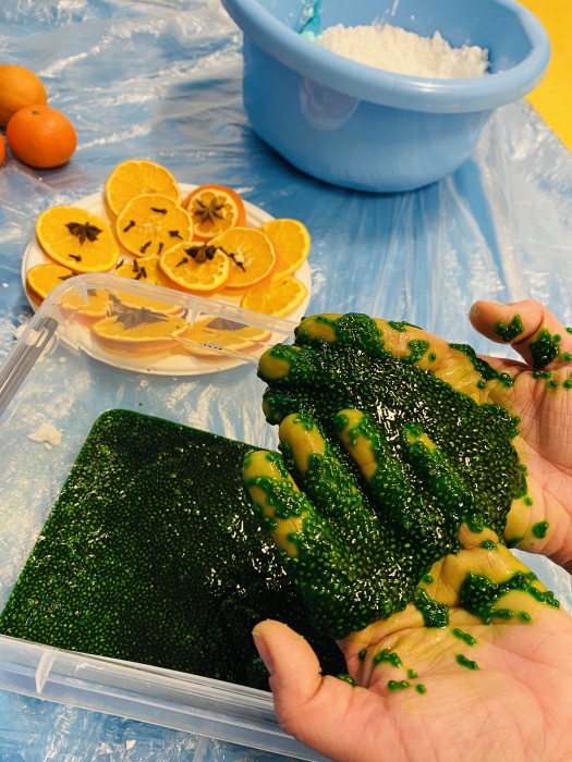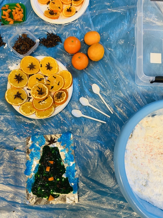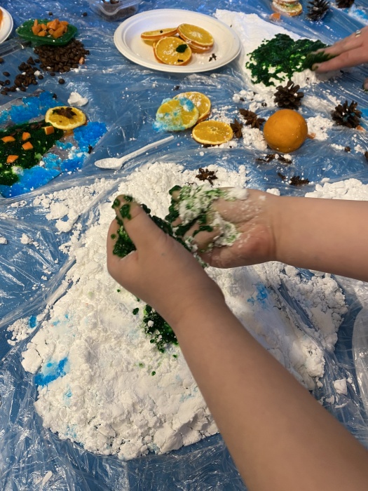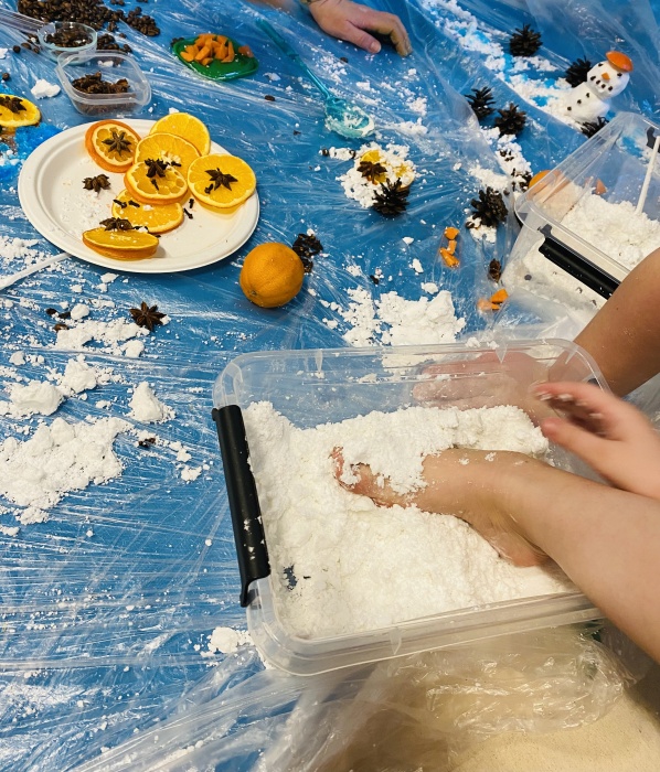 Wrażenia ciepła, zimna i lepkości wywoływały zaciekawienie, ostrożność, a także wiele radości. Przedszkolaki dekorowały bałwanka i choinkę zabarwioną masą z nasion chia, a następnie naturalnymi i aromatycznymi ozdobami takimi jak: suszone i świeże pomarańcze, goździki, anyż, kardamon. I tak zabawa zwykłymi produktami spożywczymi zapewniła dzieciom bogactwo doznań sensorycznych.