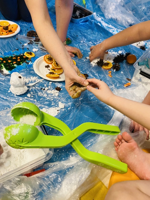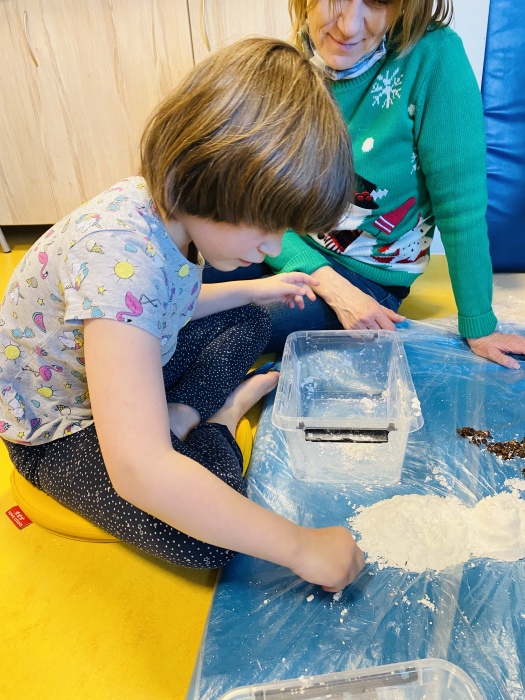 Grudniowa „Sensoryka dla smyka" przebiegała w klimacie świąteczno - zimowym. Dzieci z grupy 4 doświadczały wrażeń dotykowych lepiąc bałwana, robiąc kulki i bawiąc się masami przypominającymi śnieg.