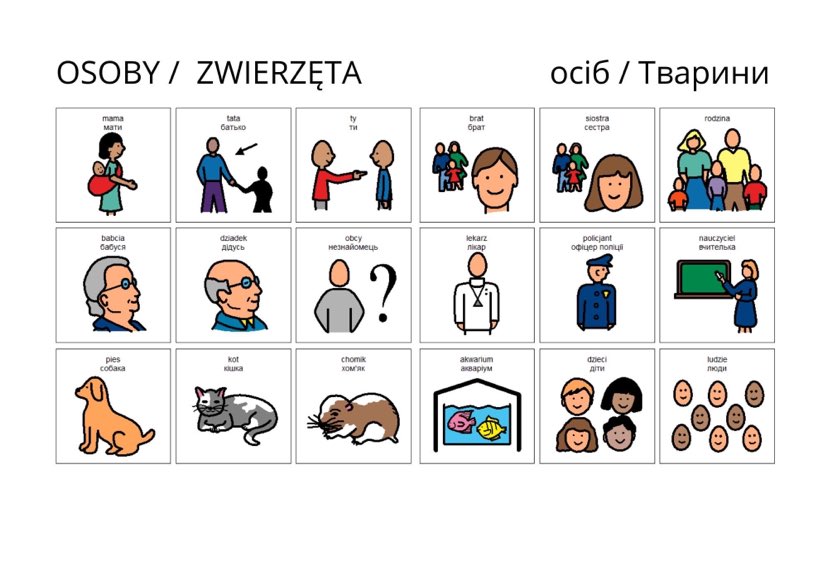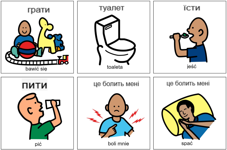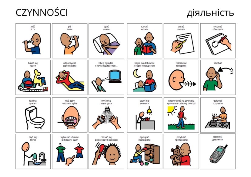 Codziennie naszą granicę przekracza wiele osób w poszukiwaniu bezpieczeństwa, wśród nich mogą być też dzieci i dorośli, którzy niekoniecznie muszą posługiwać się mową werbalną lub korzystają z niej w ograniczonym zakresie. Z myślą o nich prezentujemy kilka tablic do komunikacji alternatywnej, które są zbiorami podstawowych komunikatów w formie graficznych symboli PCS, z podpisami w języku ukraińskim. Wskazując lub podając wybrane symbole użytkownik takich tablic może w prosty sposób przekazać nam informację o swoich potrzebach, także tych podstawowych. Zachęcamy do udostępniania dalej tych materiałów, które mogą być wydrukowane i wykorzystane przez osoby niosące pomoc uchodźcom z Ukrainy.