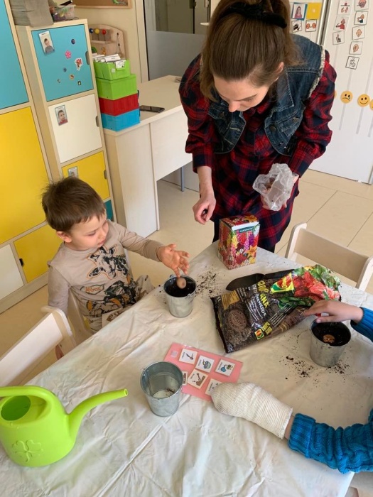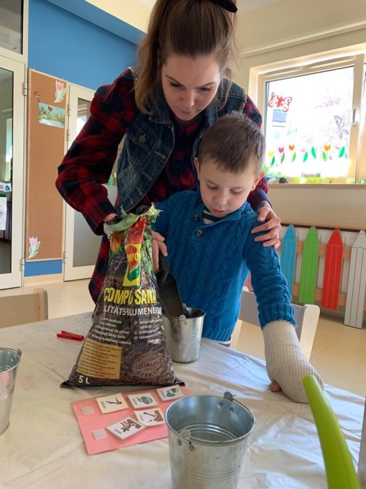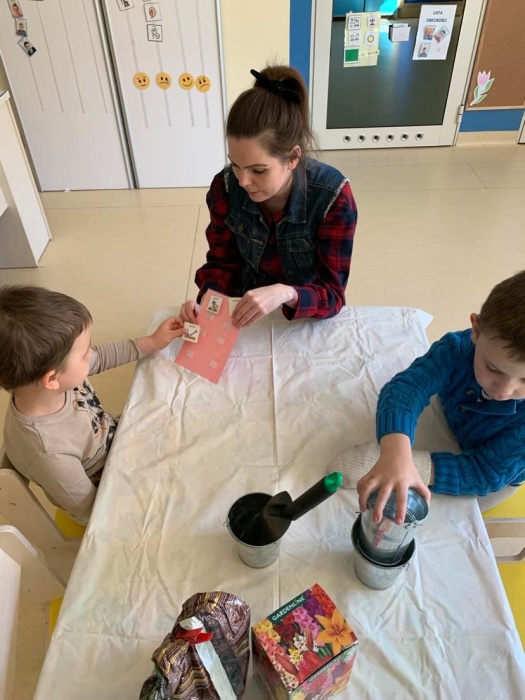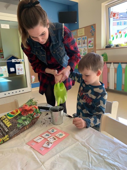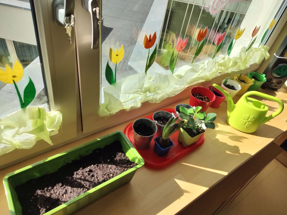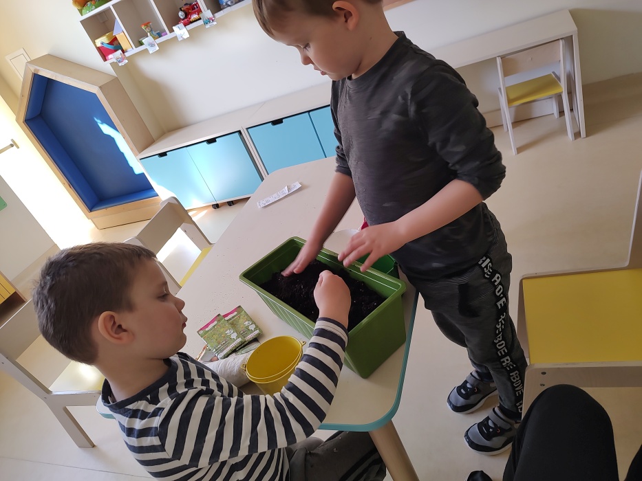 Pod czujnym okiem wychowawców, dzieci zasadziły pierwsze cebulki i nasionka, z których mamy nadzieję że wkrótce wykiełkują pierwsze kwiatki, warzywa i zioła.