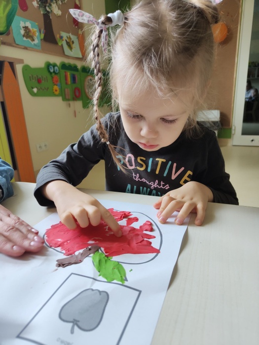 Dzieci wylepiały plasteliną obrazek przedstawiający jabłko, malowały farbami ilustrację śliwki, jabłka, gruszki, a także brały udział w zabawach ruchowych. Najmłodsze przedszkolaki przy wsparciu nauczycielek przygotowały owocowy mus, którego konsystencja, smak i zapach bardzo spodobał się dzieciom.