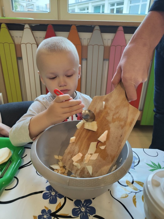 Zajęcia pt. ,,Owoce jesieni" umożliwiły wielozmysłowe poznanie sezonowych owoców dostarczając dzieciom radości tworzenia i obserwowania wytworów pracy zarówno tych plastycznych, jak i kulinarnych.