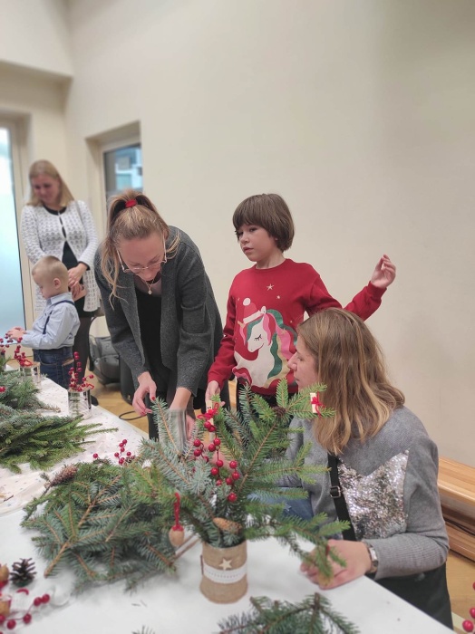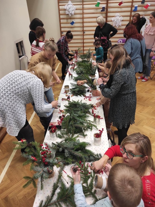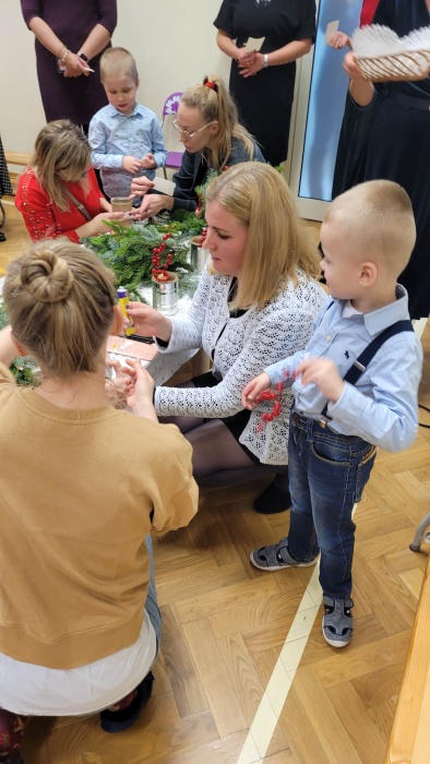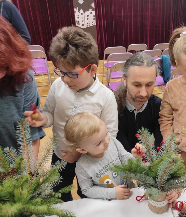 Po przedstawieniu, na scenie pojawiła się nasza muzykoterapeutka. Pani Agnieszka na swojej gitarze, przepięknie nam zagrała kilka kolęd, do śpiewania których wszyscy chętnie się przyłączyli. W ten sposób świąteczny klimat zagościł u nas na dobre, akurat wtedy kiedy przyszedł czas na jeszcze jedną atrakcję. Z leżących na stole pachnących, iglastych gałązek i ozdób, które przyszykowały nasze nauczycielki z przedszkola, każdy mógł ułożyć dla siebie swój wyjątkowy stroik.