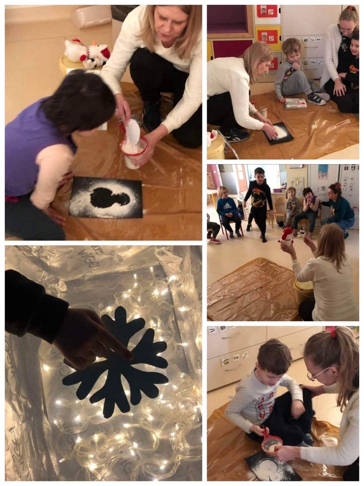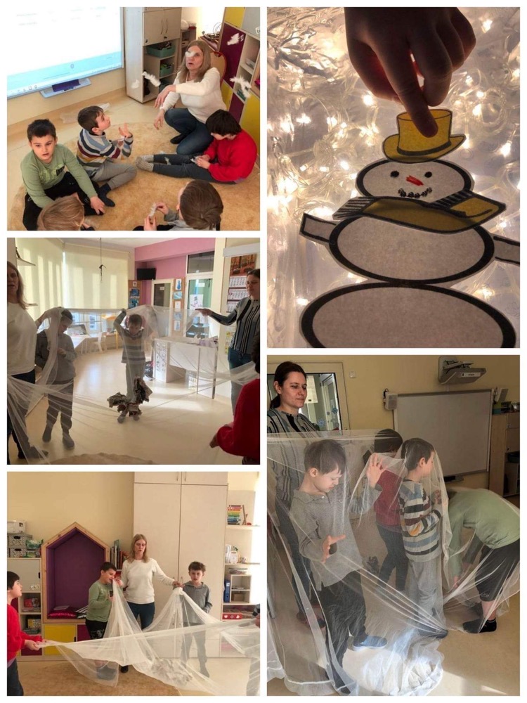 Przedszkolaki zainteresował też stolik świetlny do zabawy w ciemności, gdzie ćwiczyły percepcje wzrokową i koordynacje oko-ręka. Dzieci wyciszyły się podczas piosenki „Płatek śniegu” obserwując białe piórka i utrwaliły części ciała. Później była radosna zabawa na placu zabaw z prawdziwym śniegiem, który pojawił się niedawno.