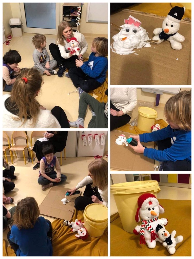 Bałwan jest jednym z symboli zimy i jest znany każdemu od najmłodszych lat. Dzieci ćwiczyły z bałwankiem podczas „Zimowej rozgrzewki”. Następnie przyglądały się jak z pianki do golenia powstaje mały bałwan oraz próbowały rysować w mące.