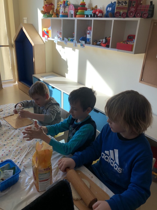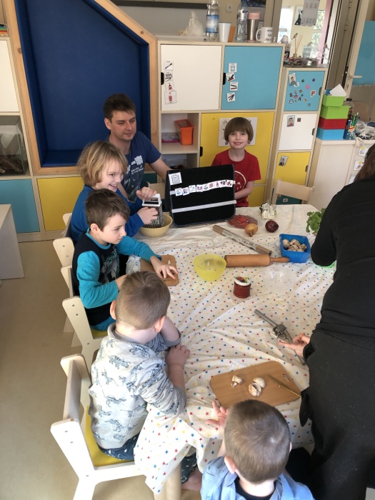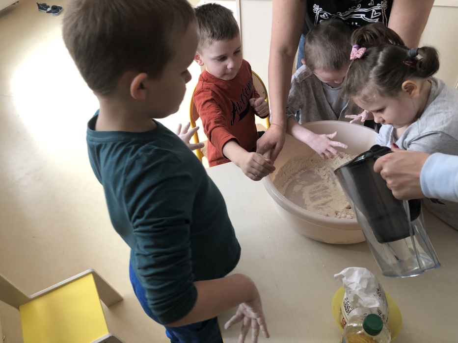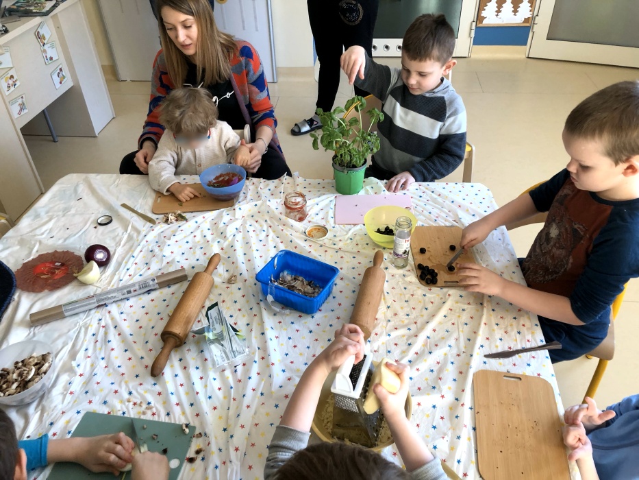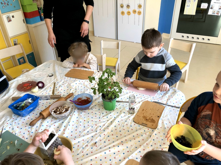 Do pracy zabraliśmy się jeszcze poprzedniego dnia, ugniatając ciasto z drożdżami, które potem powoli sobie dojrzewało w ciepłym miejscu. Nazajutrz, czyli właśnie dziś, wszyscy mali kucharze przynieśli z domu wybrane składniki, takie jak np. żółty ser, salami, papryka, bazylia, pieczarki, cebula, czy oliwki, które odpowiednio przygotowaliśmy, aby następnie udekorować nimi rozwałkowane porcje gotowego ciasta.
