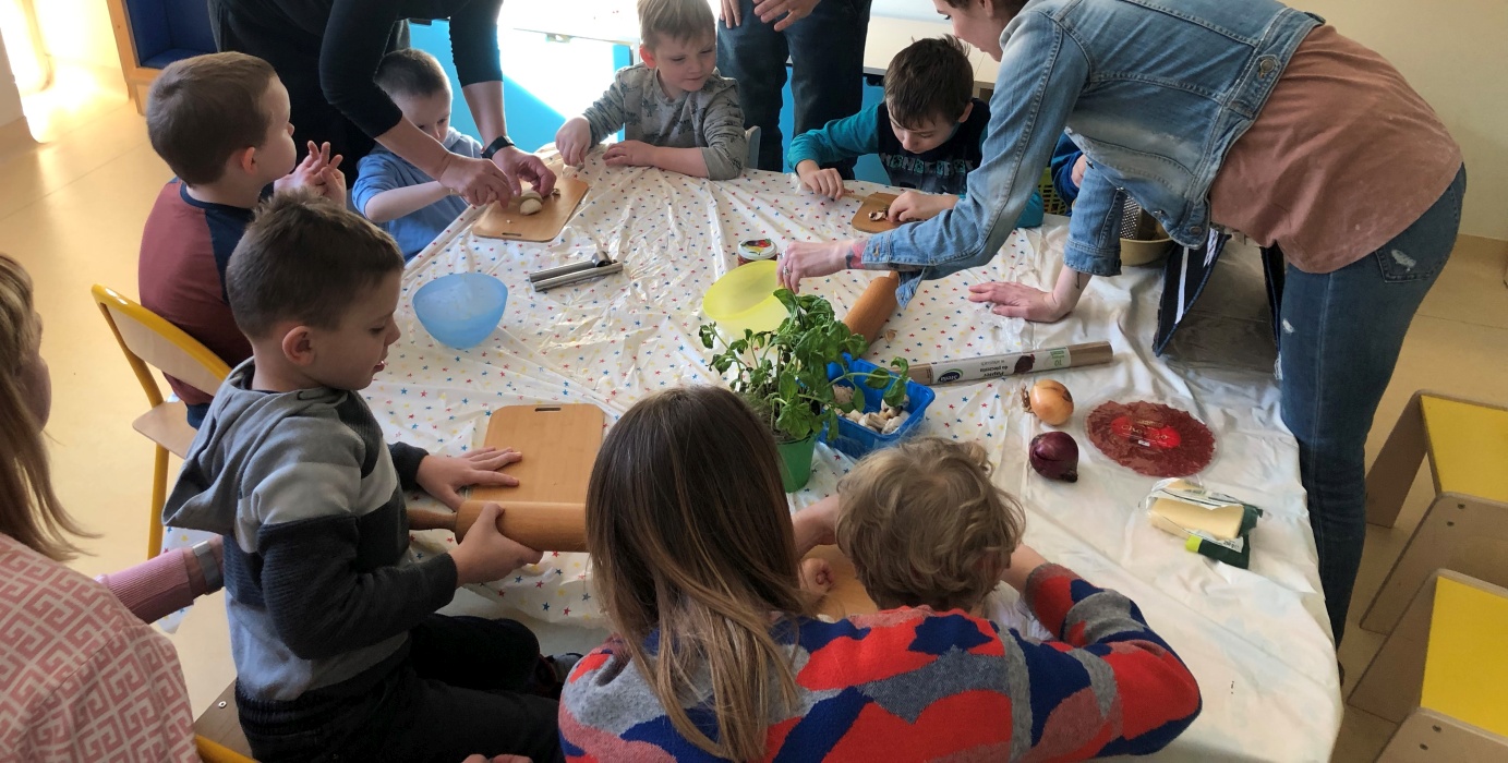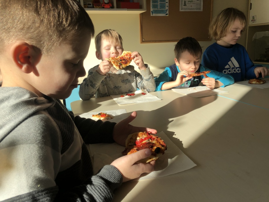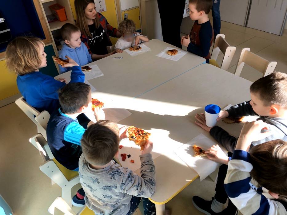 Miło było obserwować jak nasi podopieczni z wielkim zaangażowaniem wzięli udział w zajęciach. Było zarówno gwarno jak i radośnie, a każdy dał z siebie wszystko – zarówno najmłodsi, jak i ci najstarsi. Nic dziwnego, bo każdy chyba kocha pizzę, a jej przygotowanie to mnóstwo emocjonujących wrażeń i sensorycznych doświadczeń. Na dodatek mnogość składników zachęcała do poznawania wielu ciekawych słów, również przy wykorzystaniu metod komunikacji wspierającej, a wspólna praca przy stole była doskonałą okazją do jeszcze lepszej integracji w naszym przedszkolu. Zapach długo się jeszcze unosił w salach i na korytarzach przedszkola po tym, jak na talerzach nie pozostał już choćby jeden okruszek. To był zdecydowanie bardzo produktywny, wesoły i przepyszny Międzynarodowy Dzień Pizzy!