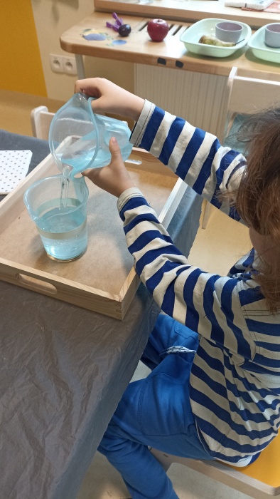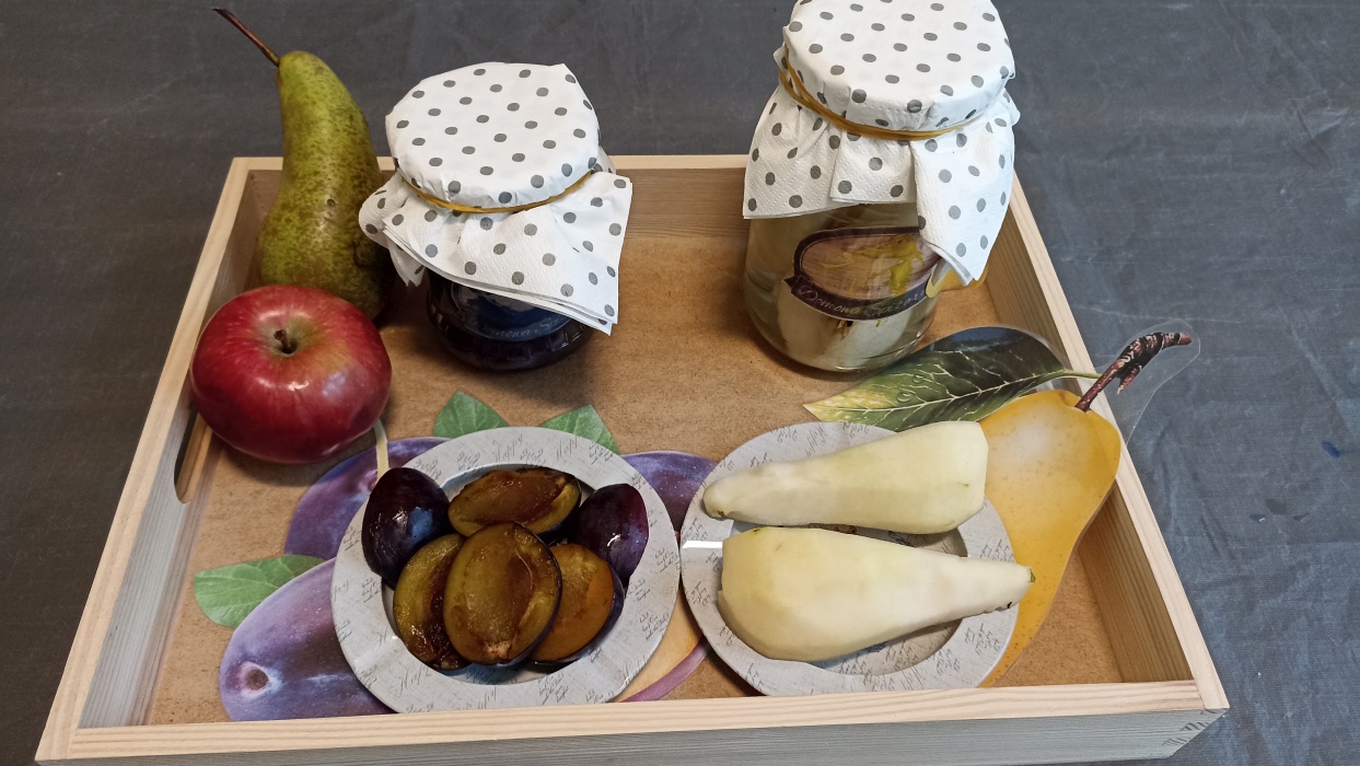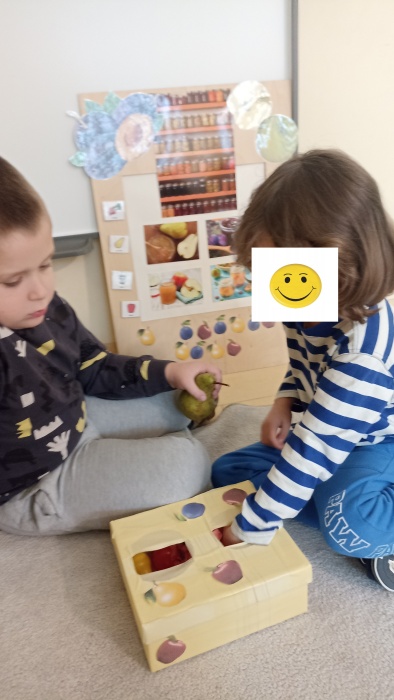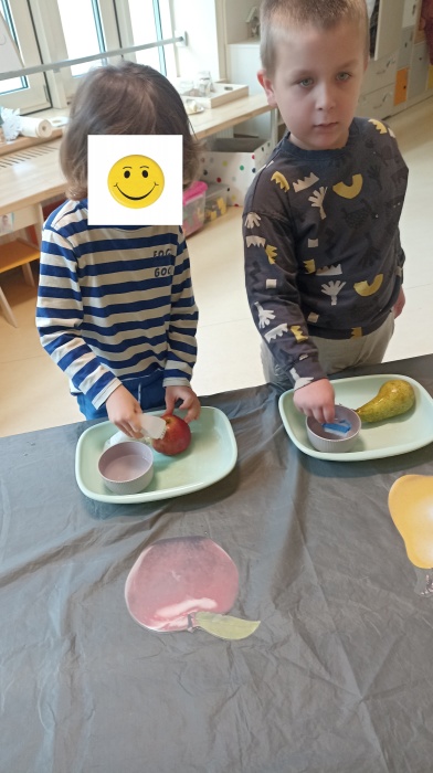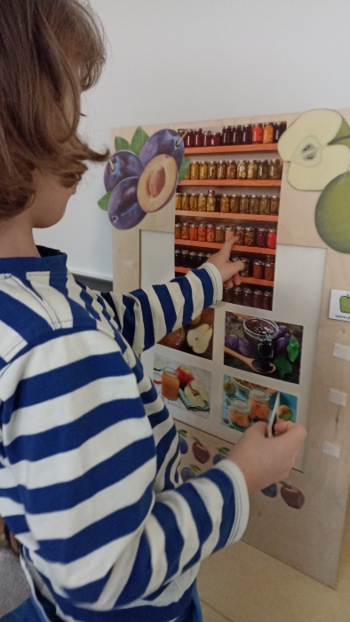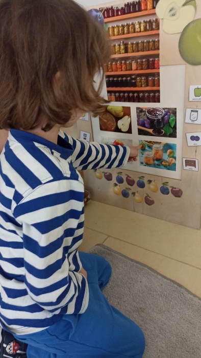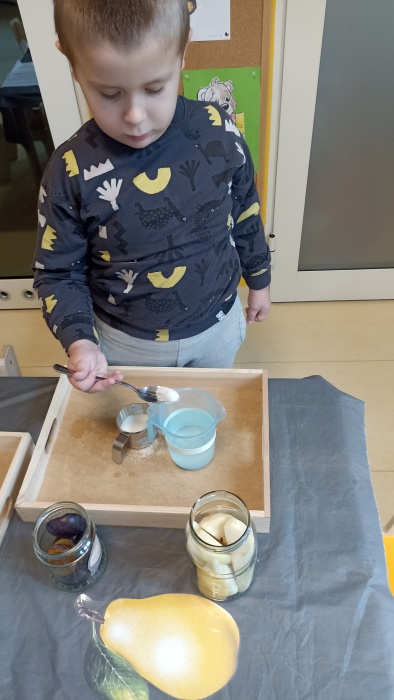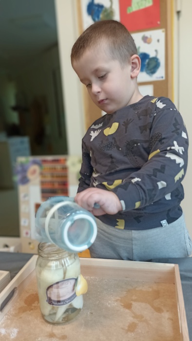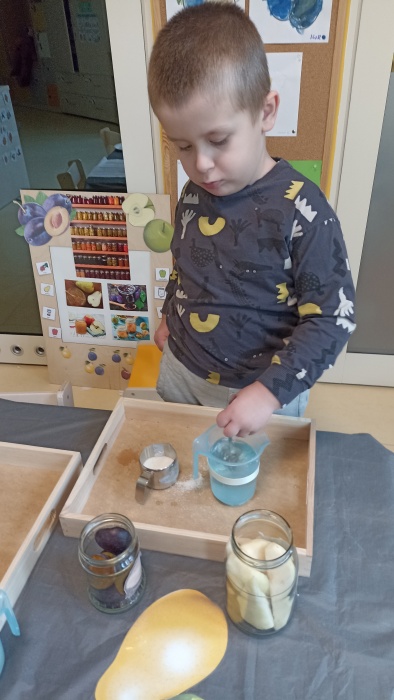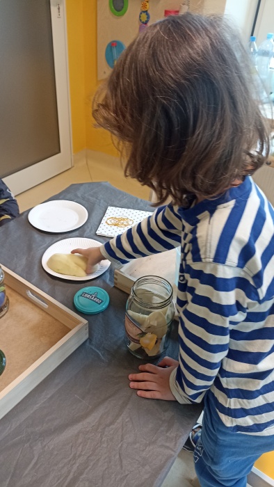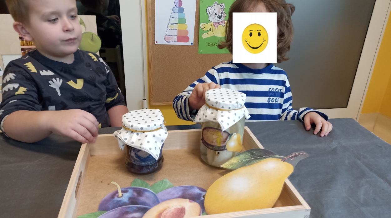 W ramach tematu zajęć „Moja spiżarnia” dzieci przygotowywały własne konfitury. Samodzielne mycie owoców przy użyciu szczoteczki, przelewanie wody do drugiego naczynia, mieszanie, wkładanie owoców do słoika, zakręcanie słoików, zakładanie kapturka na słoik to tylko nieliczne zadania, które musiały wykonać sprawne rączki. Dzieci czerpały ogromną radość z zabawy przy okazji rozwijając sprawność motoryczną swoich rąk.