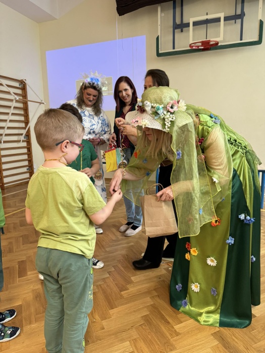 Kiedy wszyscy zebrali się w sali gimnastycznej, prosto na scenę wleciała wielka pszczoła. Nie było jednak powodów do obaw, gdyż radosna pszczółka z zimowego snu wybudzona, przybyła obwieścić dzieciom nadejście Pani Wiosny! Jednak zaraz przed publicznością ukazała się nagle Pani Zima, ale nie żeby humory nam zepsuć, a żeby pożegnać się z nami serdecznie i obiecać, że kiedyś jeszcze wspólnie bałwanka ulepimy. Za nim jednak śnieżna pora powróci, wpierw kwiaty i ciepłe dni chcielibyśmy powitać. Spróbowaliśmy więc raz jeszcze głośno Panią Wiosnę przywołać i w końcu się udało. Ubrana w zieloną suknie i obsypana barwnymi płatkami, wjechała do nas na hulajnodze, co wywołało niemałą sensację! Następnie Pani Wiosna przywitała się z uradowanymi dziećmi i obdarowała wszystkich pachnącymi kwiatami. Potem Pani Zima i Pani Wiosna, które okazały się najlepszymi przyjaciółkami, a nie wrogami jak wydawać by się mogło, wraz z dyrekcją naszego przedszkola podjęły się trudnej roli w jury, które oglądać będzie występy małych artystów.