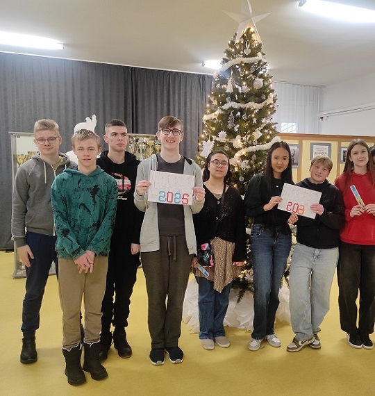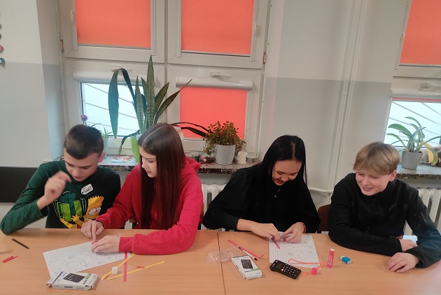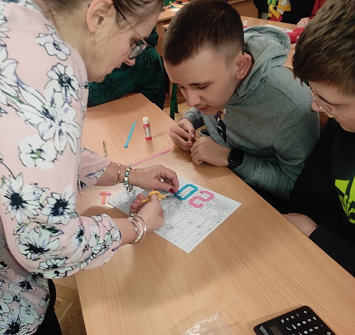 Po serdecznym powitaniu przez Panią Dyrektor SP nr 73 uczestnicy z zainteresowaniem obejrzeli klasy, salę gimnastyczną na I piętrze, bibliotekę i szkolne korytarze z pięknymi gazetkami (Bartek jako pierwszy wypatrzył portrety Stefana Batorego!). Następnie uczniowie udali się do sali matematycznej na integracyjną lekcję matematyki. Wykorzystując rok 2025 utrwalali wiadomości dotyczące kalendarza. Matematyczka, pani Iwonka zaprezentowała, jak obliczać trzecią potęgę liczb za pomocą kalkulatora oraz że 2025 to suma sześcianów liczb 1-9. Wymagającym współpracy wyzwaniem było ułożenie z pasków napisu: 2025, ale wszystkim udało się wykonać to zadanie.