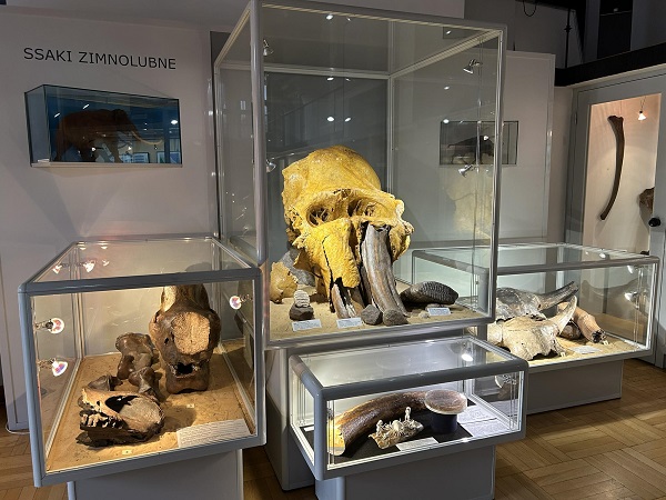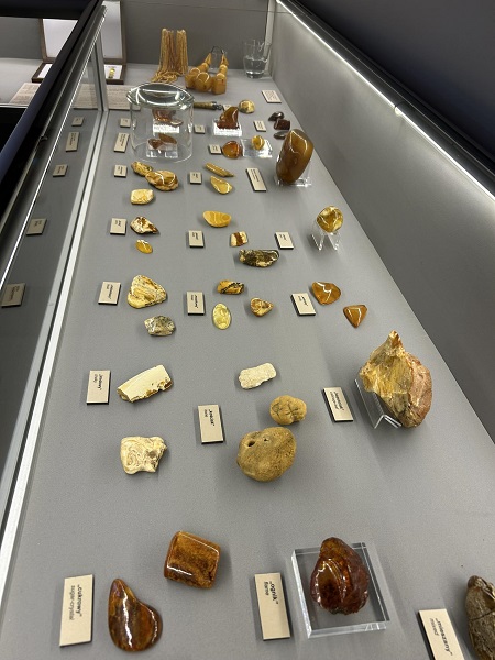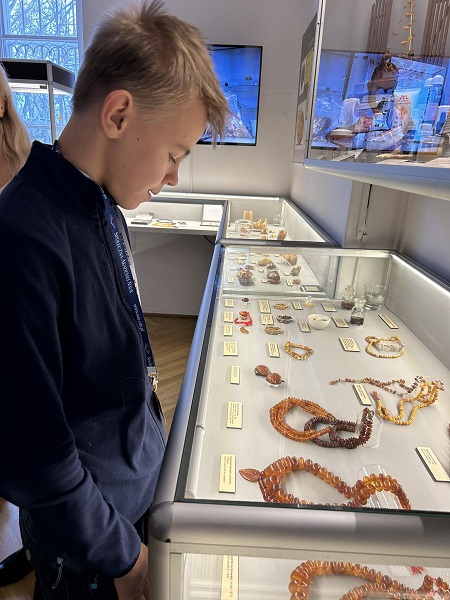 W kolejnych salach pan przewodnik zaprezentował bogate kolekcje bursztynu bałtyckiego i innych żywic kopalnych, które zaliczane są do największych tego typu zbiorów muzealnych na świecie. Podczas wycieczki dowiedzieliśmy się jak szerokie zastosowanie miał bursztyn. W kolejnej sali muzealnej oglądaliśmy meteoryty. Niektóre z nich były wielkie, a inne miały wielkość ziaren piasku, szczególną uwagę zwrócił „meteoryt pułtuski”. Przewodnik opowiadał, że są one bardzo ciężkie z powodu zawartego w nich metalu. Ostatnia do zwiedzania była sala z kośćmi pradawnych ssaków oraz fluorescencyjnymi kamieniami, które świeciły w różnych kolorach. Podczas tej interesującej wycieczki usłyszeliśmy o słoniu leśnym, który dawno, dawno temu żył na terenie obecnej Warszawy. Dla potwierdzenia tej historii pan przewodnik pokazał kości kończyny tego niezwykłego stworzenia. Patrząc na ten fragment szkieletu mogliśmy wyobrazić sobie, że słoń leśny był ogromny, większy nawet od mamuta oraz od jakiegokolwiek gatunku słonia żyjącego w dzisiejszych czasach.