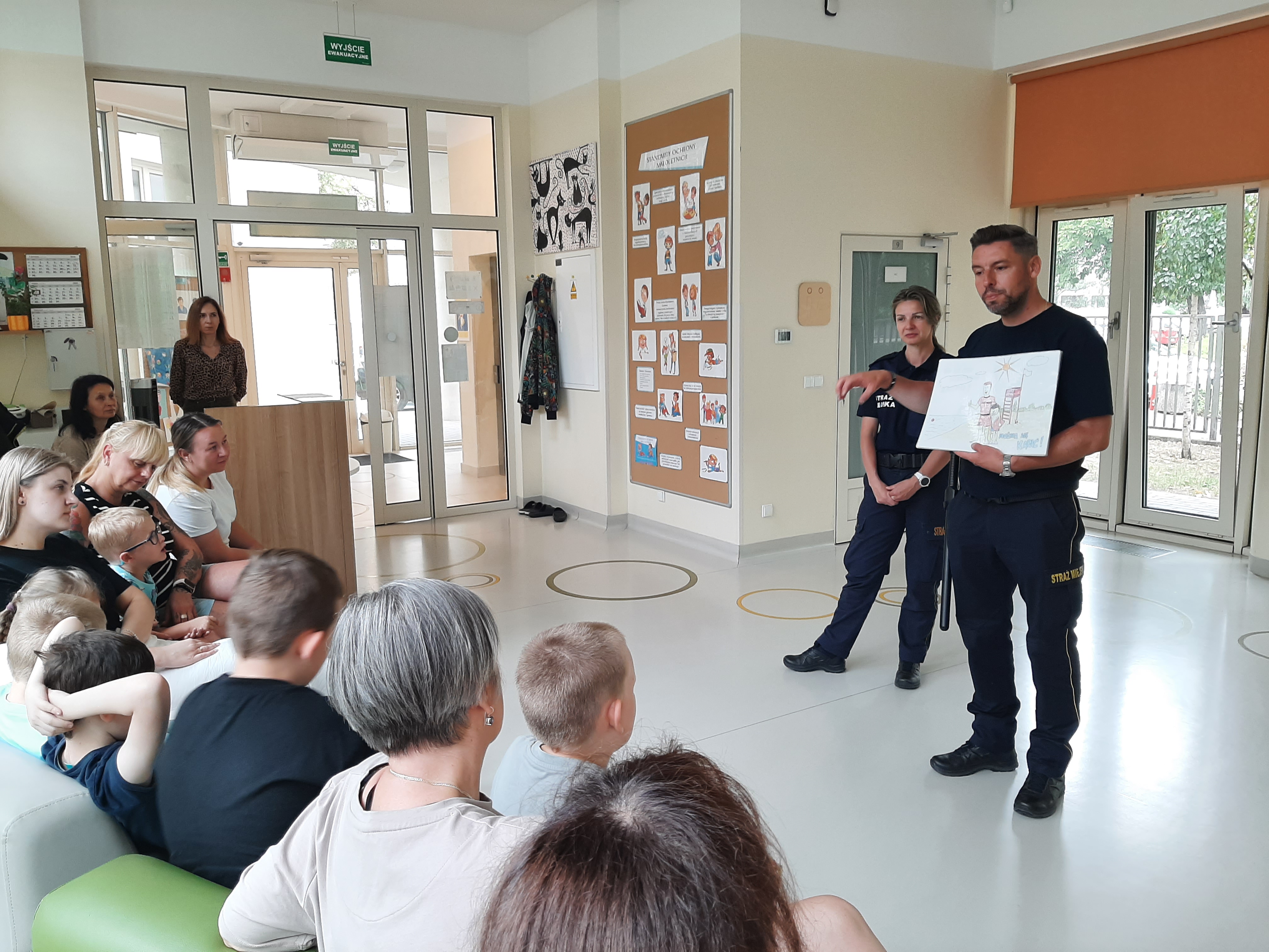 W poniedziałek, 7 lipca, nasze przedszkole odwiedziła Straż Miejska. Pracownicy z referatu profilaktyki straży miejskiej w Warszawie zapoznały wszystkie dzieci z zasadami bezpiecznego wypoczynku nad wodą.